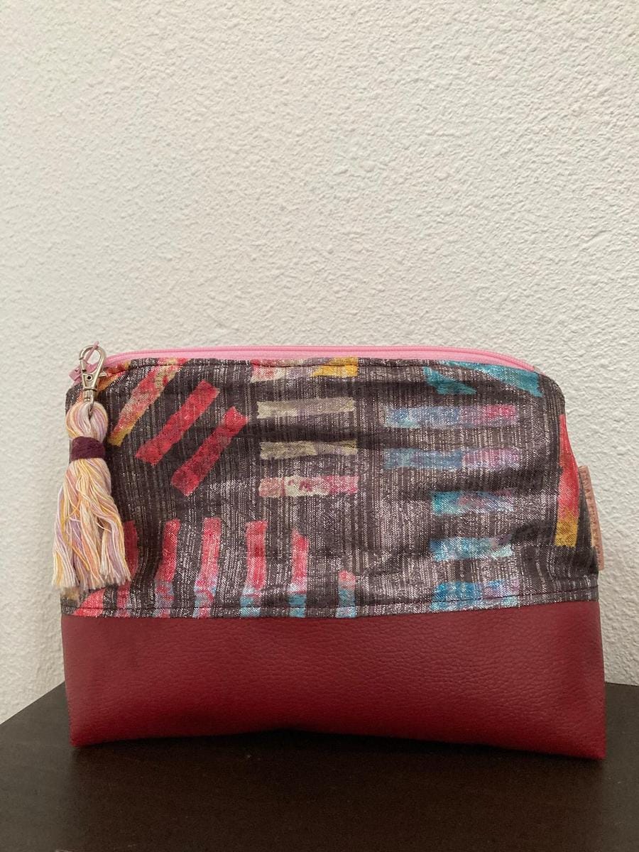Deze make-up tas uitgevoerd in roodkunstleer gecombineerd met een luxueuze grafische print met zilveren details en is de perfecte etui voor jouw mooimakers. De tas is gevoerd met een witte stof met gekleurde stippen en afgewerkt met een roze rits.
