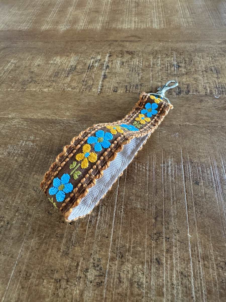 Polssleutelhanger vintage bruin blauwe en gele bloemen heeft een vintage design en is handgemaakt door Craftketeers. De handige clip bevestig je gemakkelijk aan je sleutels.